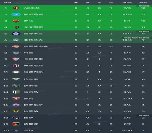 北京時間9月30日,意甲第5輪結束了所有比賽,最新積分榜如下!