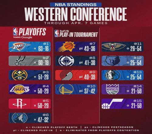 西部直通季後賽的六支球隊全部確定,分別是雷霆、馬刺、掘金、湖人、火箭和森林狼。