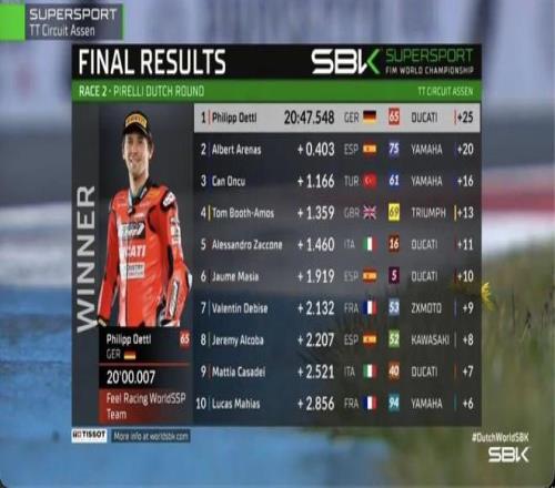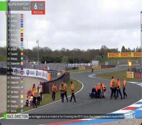 比賽還有6圈,場上出現紅旗。根據規定,比賽圈數進行了三分之二後,選手不再需要完成剩餘圈數,紅旗發生時的排名為第二回合的最終成績,張雪機車53號車手德比斯排名第七。